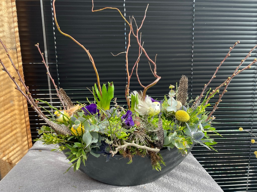 Een toef met verschillende soorten groen en bloemen uit het seizoen. De workshop duurt ongeveer anderhalf uur. Een standaard toef €27,50 maar in in overleg kleiner/groter of met schaal/plank